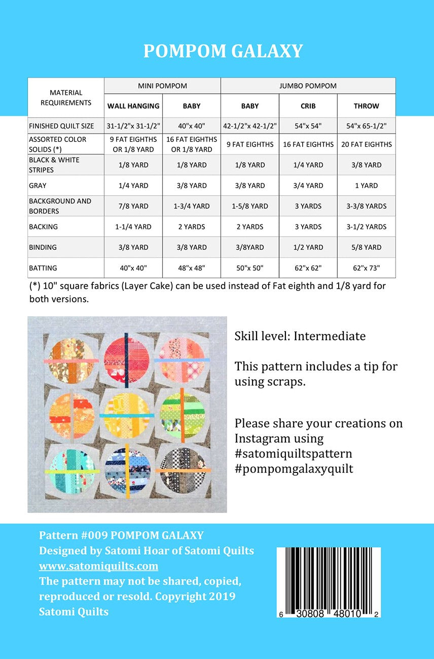 The POMPOM GALAXY quilt is a combined curved and traditionally pieced design, and is recommended for intermediate quilters and up. The pattern includes step by step instructions with many diagrams for four sizes using two different sizes of blocks. Use the small blocks to make a wall hanging (31.5” x 31.5”) and a baby (40” x 40”), or the large blocks to make a baby (42.5” x 42.5”), a crib (54” x 54”) and a throw (54” x 65.5”). Also the pattern comes with the paper templates to make both sizes of blocks.