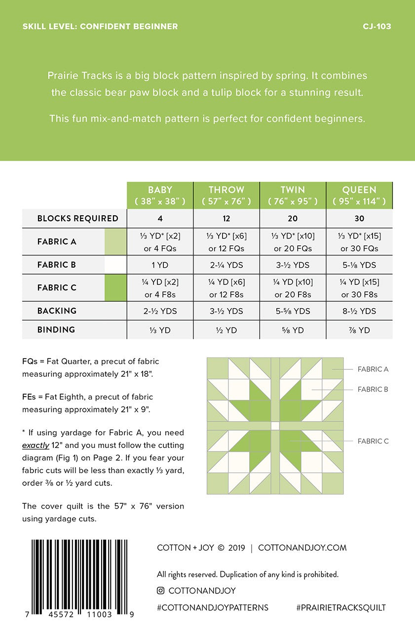 Prairie Tracks is a big block pattern inspired by spring. It combines the classic bear paw block and a tulip block for a stunning result.