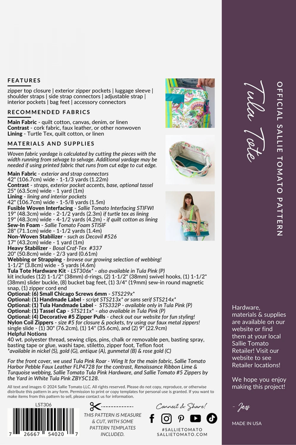 A spacious tote with multiple pockets, luggage sleeve, and d-rings for clip-on accessories by Sallie Tomato with Tula Pink. Imagine all that you could pack into the Tula Tote: an assortment of projects for a retreat, or everything you might need for a day-trip. This ultimate carry-all includes various pockets for storage, luggage handle sleeve, and plenty of d-rings for clip-on accessories to optimize your organizing! This pattern can be accessorized with LST307 Tula Accessories Pattern!
