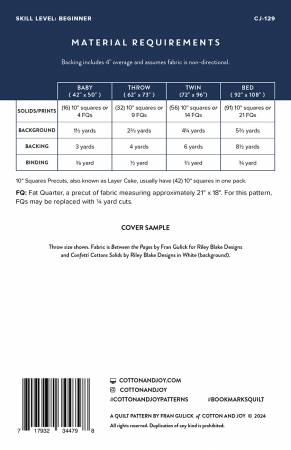 The Bookmarks Quilt by Fran Gulick of Cotton is a precut friendly, beginner friendly quilt pattern inspired by the love of reading. Pattern includes instructions for Baby (42" x 50"), Throw (62" x 73"), Twin (72" x 96"), and Bed (92" x 108") sizes. Image shown here is Throw size.