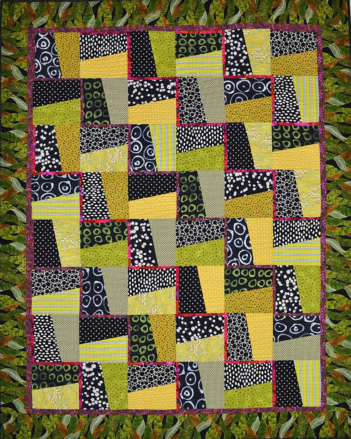 Get your funk on with Against the Rail. This quilt requires 48 nine-inch squares – 24 of two different contrasting fabrics. The strip of accent fabric adds that awe factor. And, since every other block is turned, none of the angled seams have to match so it is extremely forgiving and a great beginning quilt.