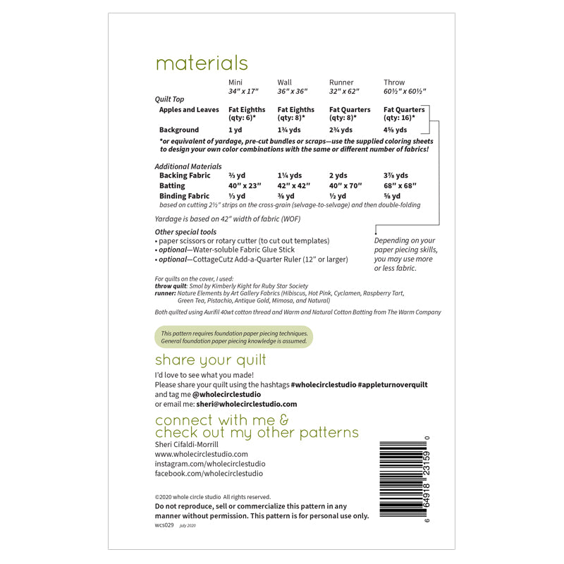 Apple Turnover is an easy foundation paper piecing pattern. Layout instructions are provided to make a Mini, Runner, Wall or Throw quilt. This tested pattern contains both detailed instructions and diagrams, making it easy to piece. Each block consists one apple, making it a flexible design to customize your own quilting project.