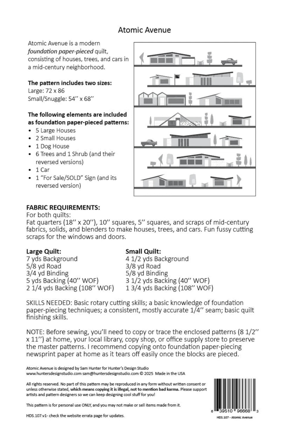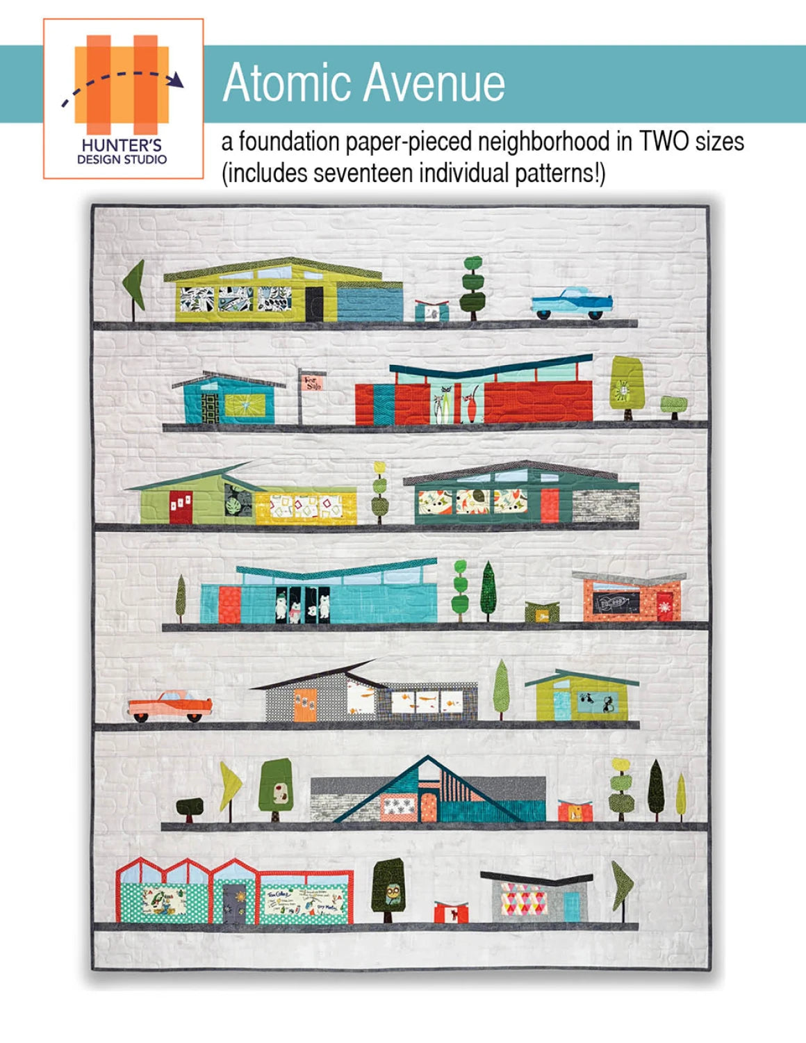 Atomic Avenue is a modern foundation paper-pieced quilt, consisting of houses, trees, and cars in a mid-century neighborhood. The pattern includes two sizes: Large: 72 x 86 Small/Snuggle: 54" x 68" Pattern includes 17 unique FPP elements to make a mid-century neighborhood
