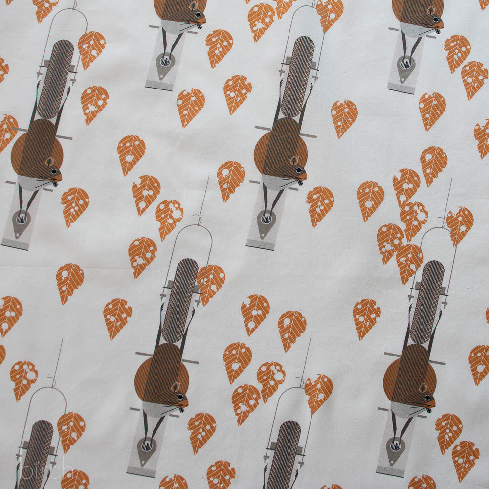 Furred Feeder features a clever squirrel snacking on what it finds in the bird feeder, with orange fallen leaves on a cream ground.