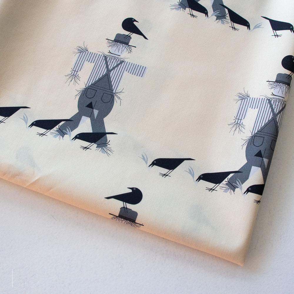 Keep your crops safe with a scare crow! This black and white print featuers a not-so-scary scare crow with crows feeding on a muted lemon cream ground.