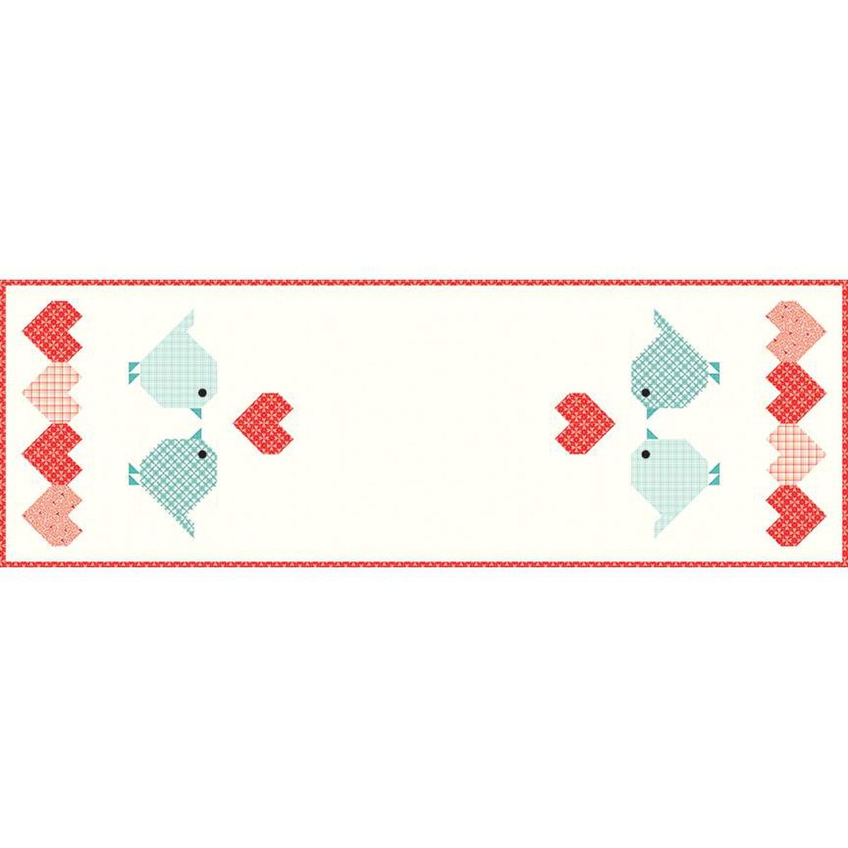 The Heart to Heart Runner Boxed Kit includes pattern and fabric for runner top and binding. Backing not included. Fabric featured is You & Me by Sandy Gervais. Pattern is also by Sandy Gervais of Pieces from My Heart. Finished size is 18" x 54 1/2". Kit comes in a solid box with a printed belly band label. Box size is approximately 6" x 10" x 2 1/2".