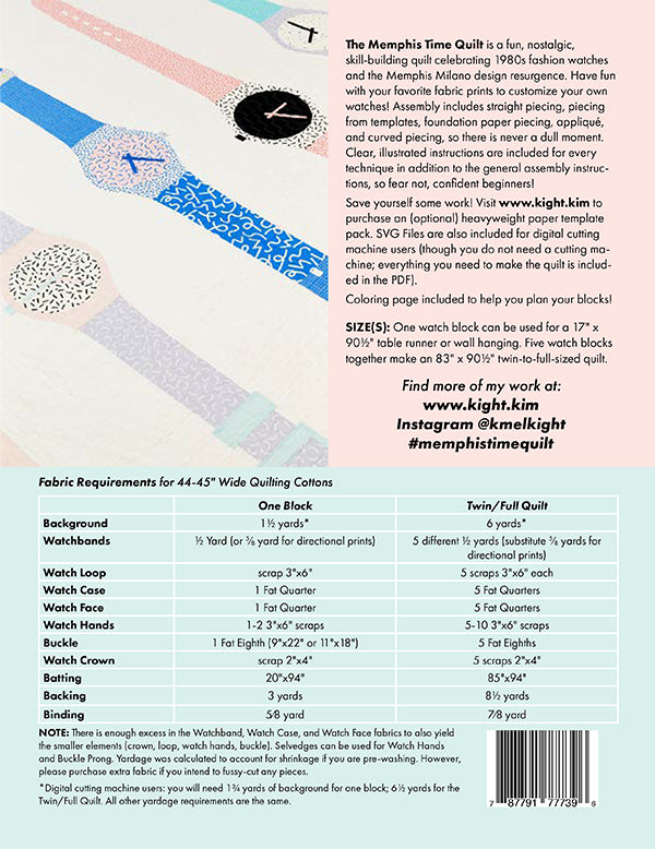 This is a fun, nostalgic skill building quilt celebrating 1980's fashion watches and the Memphis Milano design resurgence. Have fun with your favorite fabric prints to customize your own watches! Assembly includes straight piecing, piecing from templates, foundation paper piecing, applique, and curved piecing so there is never a dull moment.