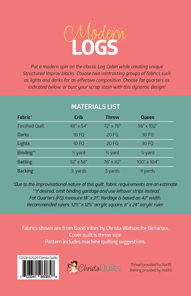 Modern Logs is offered in 3 sizes (Crib, Throw, or Queen), made from 20, 40, or 60 fat quarters where half are light/low volume and half are dark or more saturated. To get higher contrast, use the back side of some of your light colored fabrics.