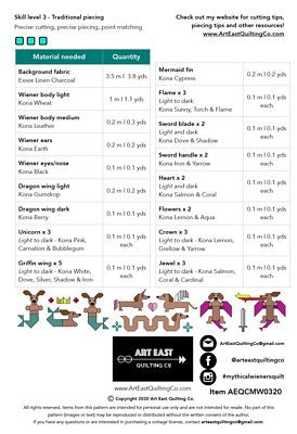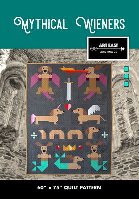 Mythical Wieners includes complete instructions for making a 60 in x 75 in quilt (as seen on the cover) or individual blocks for smaller projects. The individual wiener dog/mythical creature hybrid blocks include: the drag-weens (19 in x 24 in each), the uni-ween (21.75 in x 13 in), the griff-ween (23 in x 12 in ), the dach ness monster (40 in x 7.5 in), the front-facing merweens (14.5 in x 20 in each) and the sideways merween (20 in x 11 in ). The pattern also includes six smaller filler blocks including: a fire flourish, a heart, a sword, flowers, jewels and a crown. This project is designed using conventional piecing techniques (no paper-piecing).