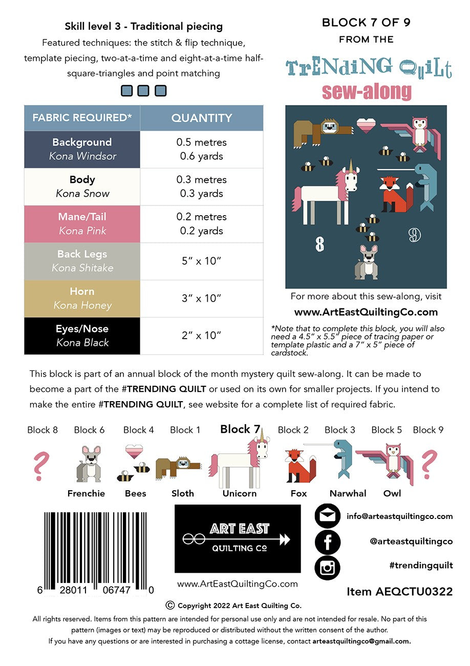 The #TRENDING Quilt - Unicorn Block includes complete instructions for making a 25-1/2 x 25-3/4in (finished) unicorn block that may be used to produce the #TRENDING Quilt (from the #TRENDING Quilt Sew-Along) or to make other quilts, pillows and other projects. This block is designed using conventional piecing techniques (no paper-piecing).