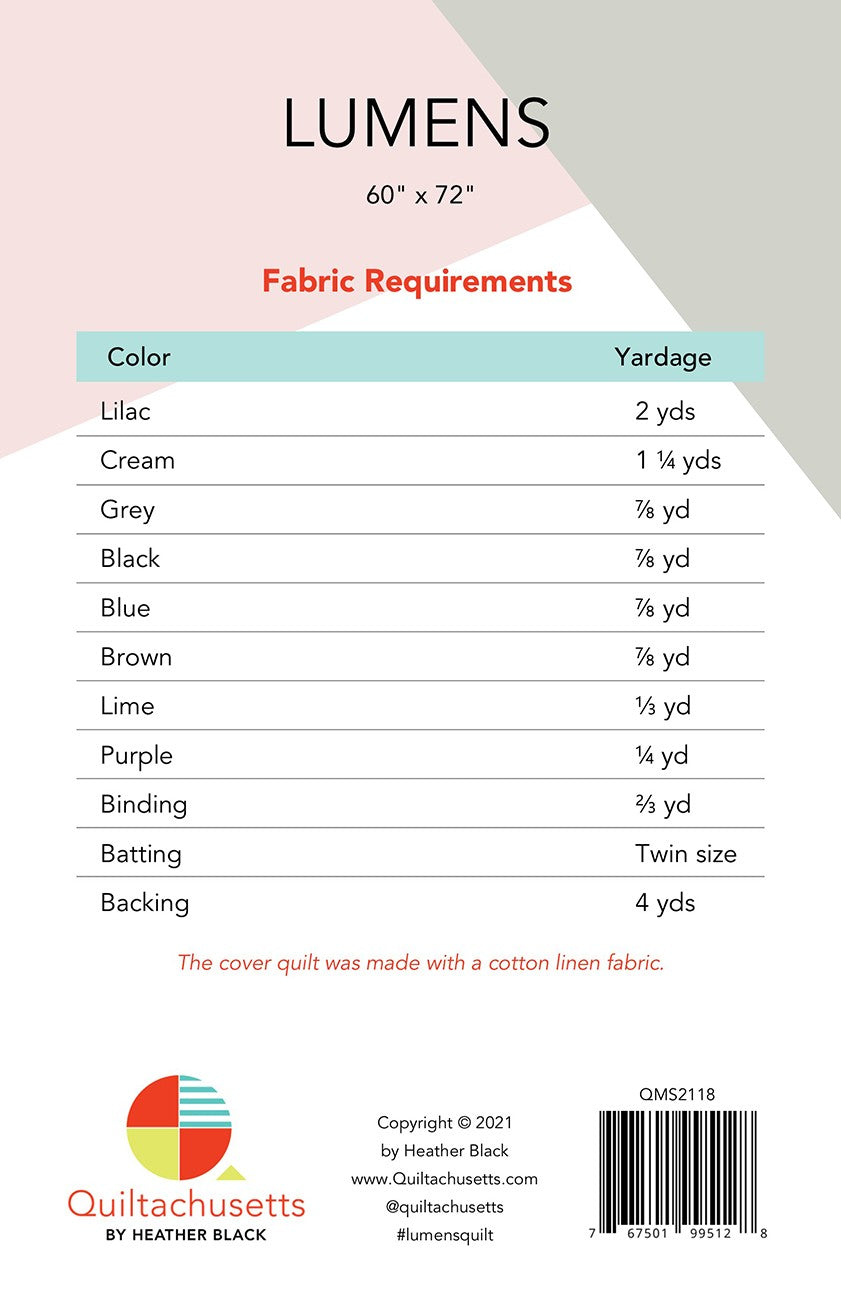 Lumens is a modern mix of shapes and textures. This 60'' x 72'' quilt uses a clever piecing technique to give the illusion of a giant circle. This 16 page pattern includes easy to follow instruction, color diagrams, full size templates and a coloring page.