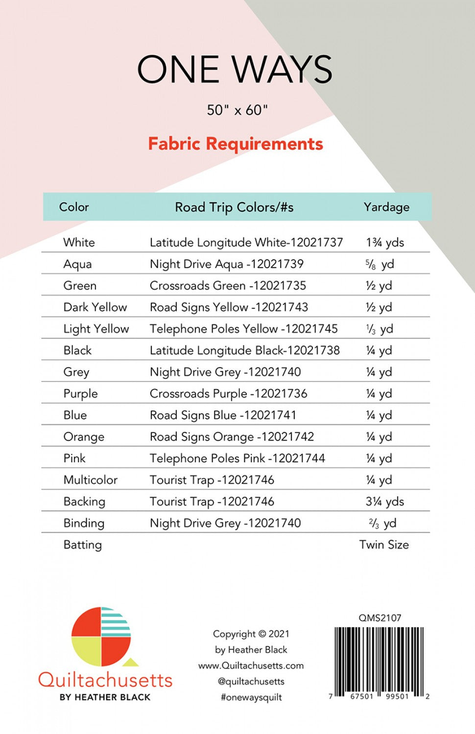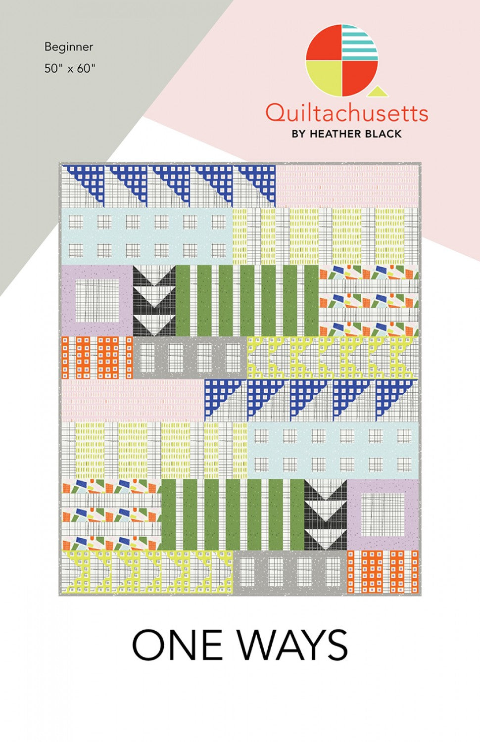 This modern beginner sampler quilt is full of movement and interest. One Ways is a 50in x 60in quilt featuring fabrics from Paintbrush Studios Road Trip by Heather Black. The 13 page pattern features easy to follow instructions, full color diagrams and a coloring page to add your own color palette or testing quilting ideas on.