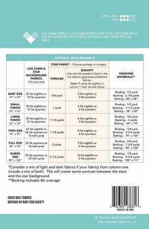Log Cabin Stars is a fun and modern take on a log cabin quilt. Log Cabin Stars is fat eighth or fat quarter friendly. The pattern includes 6 size options; baby, small throw, large throw, twin, full and queen.