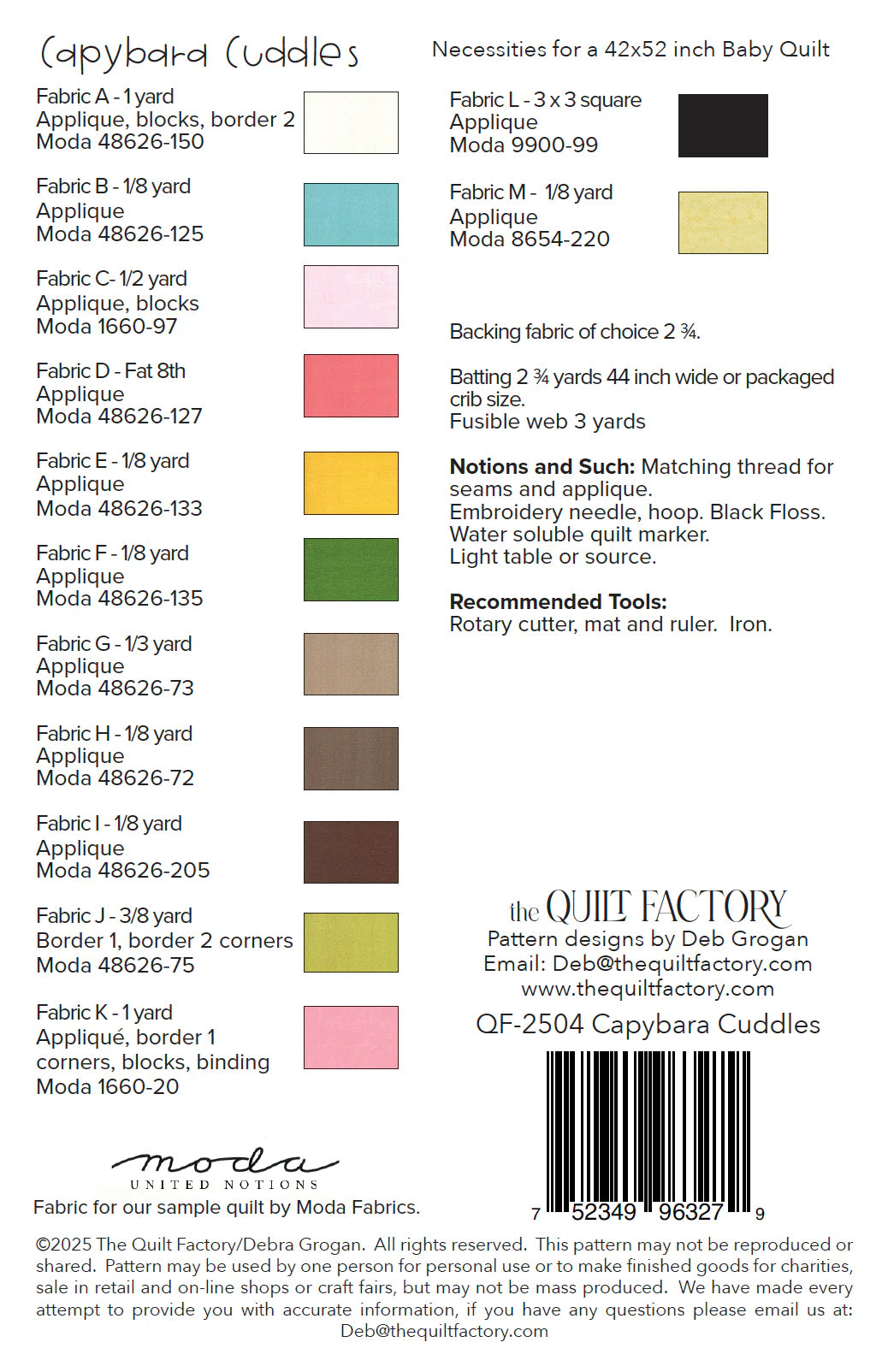 Capybara Cuddles is an adorable quilt perfect for baby. This charming baby quilt adds a whimsical touch to any nursery, it features sweet capybara appliqués dressed in florals and accessories, surrounded by playful motifs like butterflies, sunshine, and blossoms. Our easy to piece and appliqué quilt pattern includes instructions and templates and now includes full size layout guides!