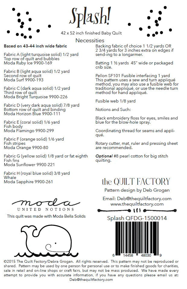 Splash! Fun modern baby quilt with adorable appliquéd whale and fish. Easy to follow instructions and templates included in the pattern along with a guide for big stitch style quilting with pearl cotton.
