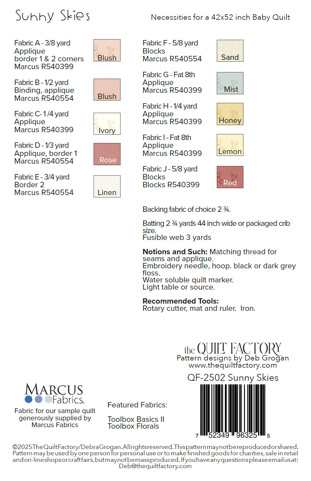 This delightful baby quilt Sunny Skies fills the nursery with whimsy. Featuring cheerful appliqués of smiling suns, fluffy clouds, and bright rainbows. This charming quilt brings sunny daydreams and cuddly softness to your little one’s space. Our easy to piece and appliqué quilt pattern includes instructions and templates and now includes full size layout guides!