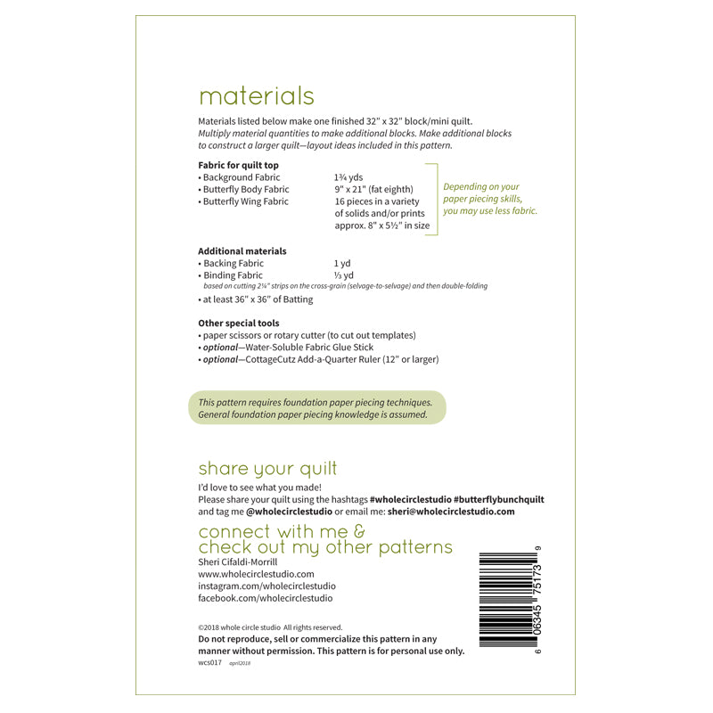 Butterfly Bunch is a fun graphic wallhanging / mini quilt that uses foundation paper piecing techniques. Make additional blocks to make a larger quilt (layout ideas are provided to make a lap, twin or queen quilt). This tested pattern contains both detailed instructions and diagrams, making it easy to piece. Each butterfly block measures 14″ x 14″ making it a flexible design to customize your own quilting project.