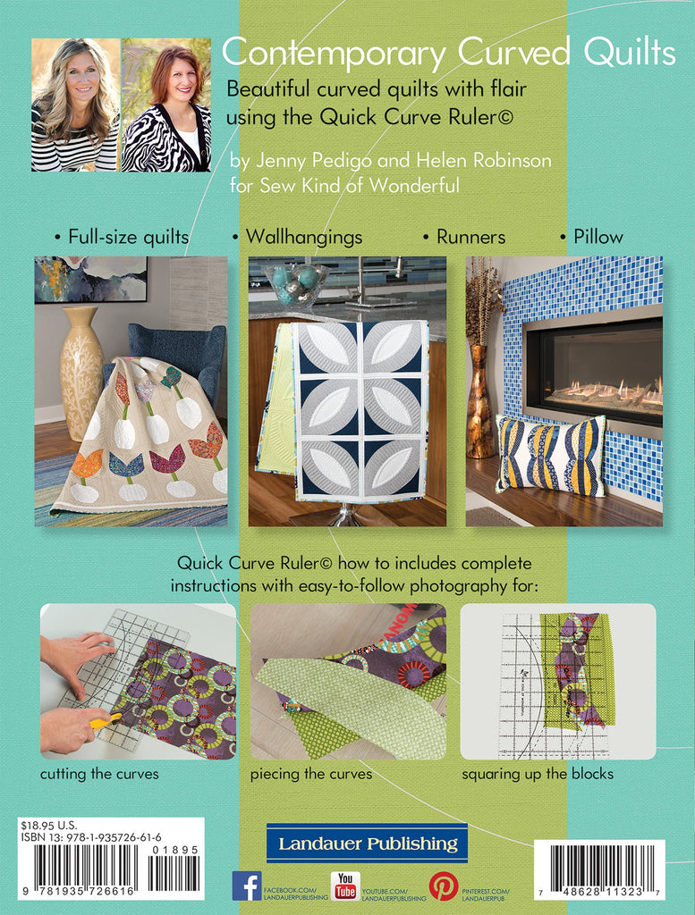 This quilting book is filled with eight fun projects, all with a curvy flair. Jenny Pedigo and Helen Robinson of Sew Kind of Wonderful give you 8 quilt projects using their Quick Curve Ruler all in one book. Contemporary Curved Quilts includes full size quilts, wall hangings, table toppers and pillow. Includes complete step-by-step instructions, clear concise how-to. The beautifully quilted projects inspire quilting creativity. Also complete easy-to-follow instructions and photographs for using the Quick Curve Ruler©. Easy enough for an experienced beginner and challenging enough for an advanced quilter.