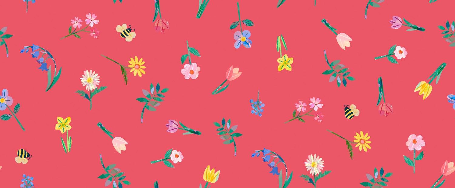 Full of charm and painterly detail, the Flower Market collection captures the whimsical spirit of a bustling spring flower stall. With bumblebees buzzing, wheelbarrows brimming with blooms, and perfectly potted tulips, each design is created using a unique hand painted collage technique, giving the collection its playful, illustrative feel.