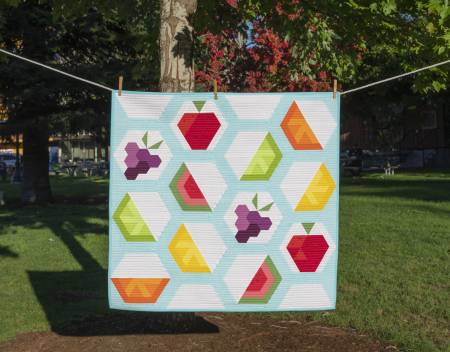Fresh Fruit is a fun sampler quilt with each block teaching a new way to use the Large Creative Grids, 60-degree diamond ruler. There are six different fruit blocks: lemons, limes, oranges, strawberries, watermelons, and grapes. This quilt is so fun to put together and a great way to build skills in piecing each block's combination of shapes. The Fresh Fruit pattern comes with two layouts: a lap quilt size that includes the striped background blocks and a wall-hanging size made up of the fruit blocks only. This pattern is fully-illustrated, with step-by-step directions, for easy assembly with no Y seams! Lap: 53" x 56", Wall Hanging 36" X 35 1/2".