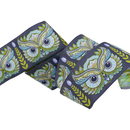 Discover the enchantment of Tula Pink’s Full Moon Forest II with this stunning 2" wide Jacquard Woven Ribbon, exclusively from FreeSpirit Fabrics. Featuring a moody blue-gray background, this ribbon is adorned with intricately detailed, ornate owls that capture the essence of whimsical woodland creatures.