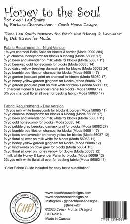 Pattern includes instructions for dark quilt featuring the black panel and a light quilt featuring the white panel from Deb Strain's Honey & Lavender fabric line. The quilts measure 50" x 62" and depicts bees and flowers and pieced blocks. All piecing.
