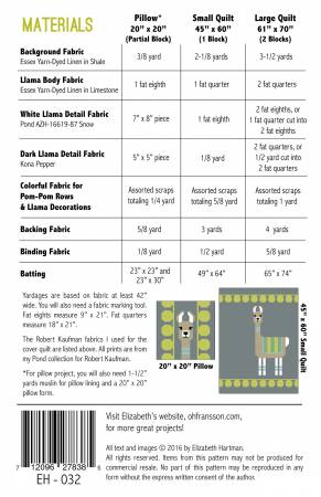 20in x 20in pillow pattern, featuring a llama face and more pieced ball fringe. All projects are made using conventional patchwork techniques. No paper piecing! The pattern includes a complete list of the cut pieces need to make a single block, making it easy to use scraps or make single blocks for other projects.