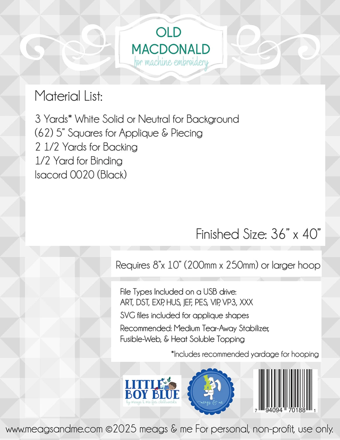 This quilt pattern brings the classic Old MacDonald song to life with playful farm animals, a tractor, and bold lettering. It features machine embroidery and applique, combined with patchwork for a fun, textured look. The animals have a whimsical, sketch-like design with fabric accents. Perfect for farm lovers! Also available for hand embroidery. Requires 8" x 10" hoop or larger. File types included: ART, DST, EXP, HUS, JEF, PES, VIP, VP3, XXX Finished size: 36" x 40"