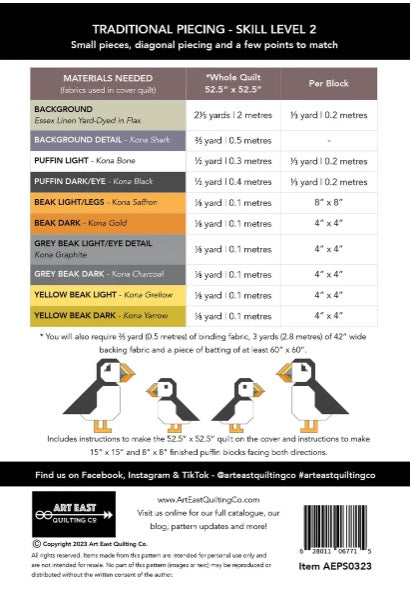 This pattern includes the instructions for creating the 52.5” x 52.5” quilt as shown on the cover. This quilt is traditionally pieced. The pattern is laid out in a way that you can also create the large puffin block (15” x 15” finished) and small puffin block (8” x 8” finished) individually for smaller projects or different quilt layouts. Instructions and images are included for creating the blocks facing in both directions.