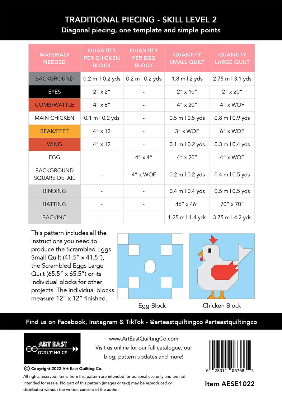 The Scrambled Eggs - Quilt Pattern Booklet This pattern includes the instructions for creating a fun double-repeated block quilt in two sizes (41.5" x 41.5" and. 65.5" x 65.5"). Each quilt contains chicken blocks and egg blocks, each measuring 12" finished. The smaller quilt features five chicken blocks and four egg blocks, while the larger of the two features 13 chicken blocks and 12 egg blocks. You can make all your blocks the same, of use different fabrics in each one. This quilt is pieced using traditional sewing techniques and one template to create the eggs.Ā An Egg Template sheet insert is included. The pattern is 12 pages, printed in full-colour and saddle stitched with a soft laminate cover.