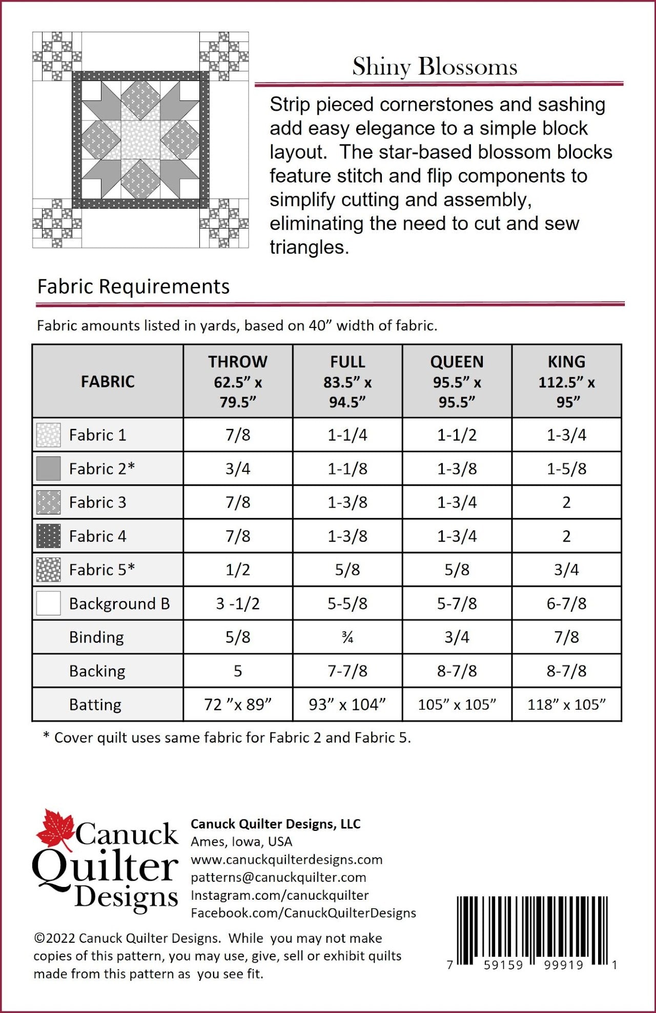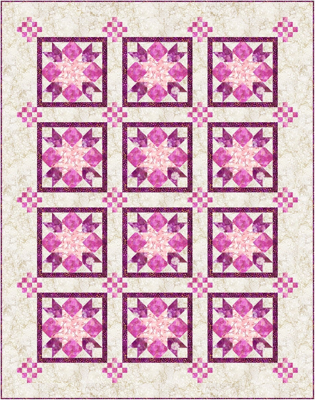 Strip pieced cornerstones and sashing add easy elegance to a simple block layout. Star-based blossom blocks feature stitch-and-flip components to simplify cutting and assembly, eliminating the need to cut and sew triangles.