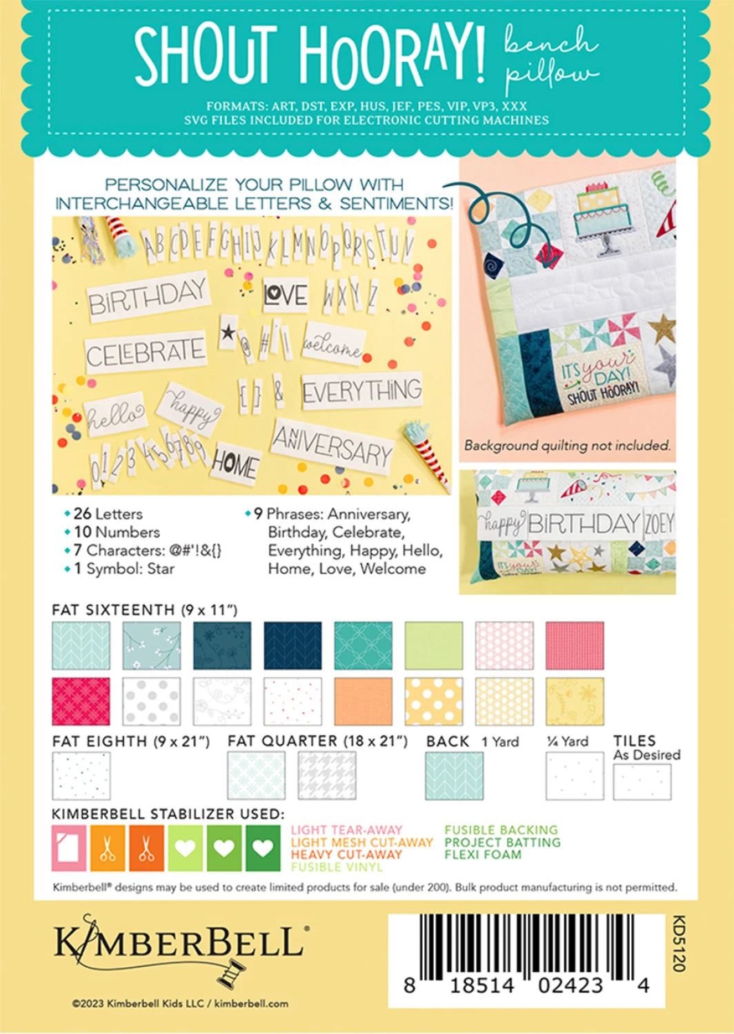 “It’s your day! Shout hooray!” Kimberbell’s Shout Hooray Bench Pillow celebrates the people you love with confetti, cake, and so much more. Stitch names, dates, and greetings with our included alphabet and sentiments, then feature your message in our letterboard panel! Applique Glitter, Embroidery Leather, and iridescent Mylar add sparkle and shine to the stars, cake, and banner, while bright balloons float from strings of Kimberbell Twine. Add Flexi Foam and Iron-on Vinyl to make balloons “pop!” Pretty pinwheels and nine-patch blocks are easily pieced in-the-hoop, and applique gifts are topped with beautiful bows. With optional background quilting and delightful designs, your Shout Hooray Bench Pillow is perfect for every special occasion!