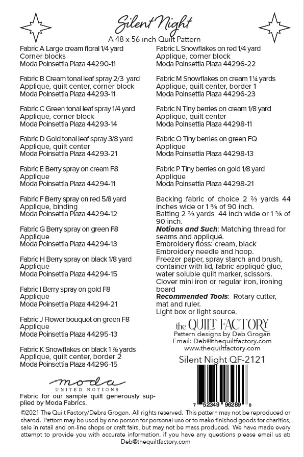 Silent Night is created with pieced sections and appliqué. The appliqué on our sample quilt was done using the freezer paper method and the quilting was done by machine using a small blanket stitch. You may choose other methods like fusible web or needle turn by hand. The templates are already reversed.  We’ve included basic written instructions in this pattern but if you are fairly new to this method of appliqué, there are many video tutorials available on Youtube that give great demonstrations, or if you need to just brush up on your skills. We will go step by step and you will find this quilt goes together very easily and is so fun to make!  Make this beautiful quilt part of your Holiday traditions!