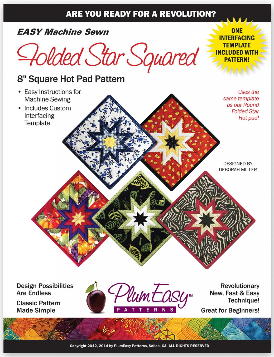Includes: pattern and one interfacing template. You will need one template per hot pad as the triangles are not pieced together, but laid over-laping each other and the interfacing forms a basis for the hot pad, as well as being a ruler to position the triangles on.