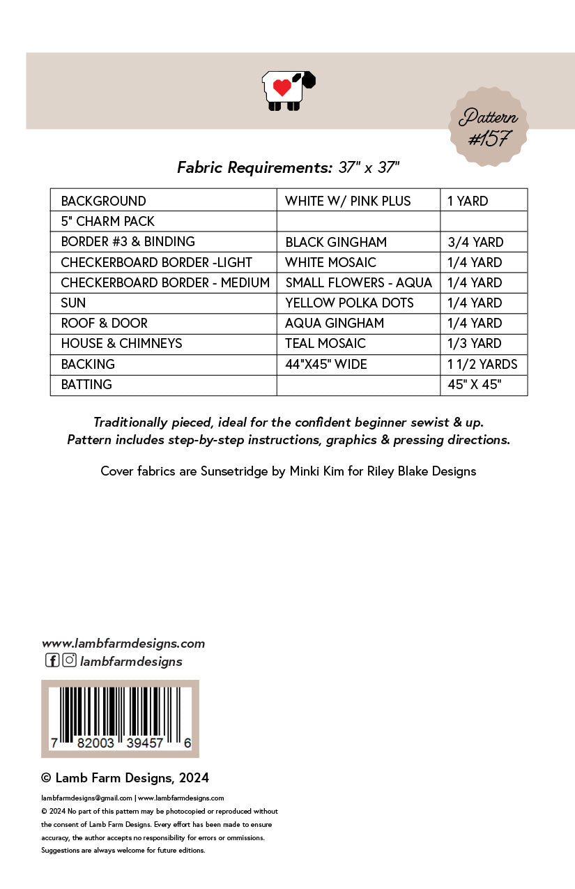 The Poppy House Quilt by Lamb Farm Designs is 5" stacker friendly and features a pieced house. Finished size is 37" x 37".