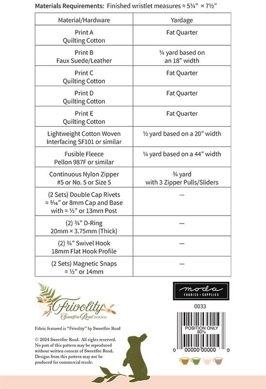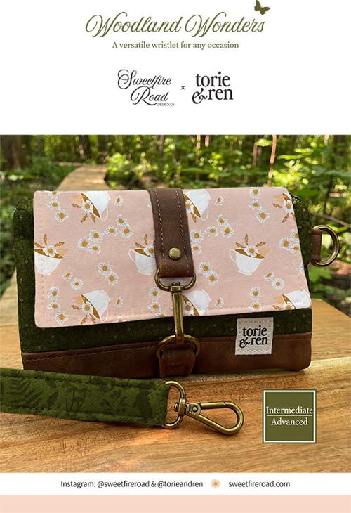 The finished wristlet measures 5.25" x 7.5", making it a compact yet practical accessory. It features multiple zippered pockets, open pockets, a pincushion, and a needle landing, all secured with a zipper closure.